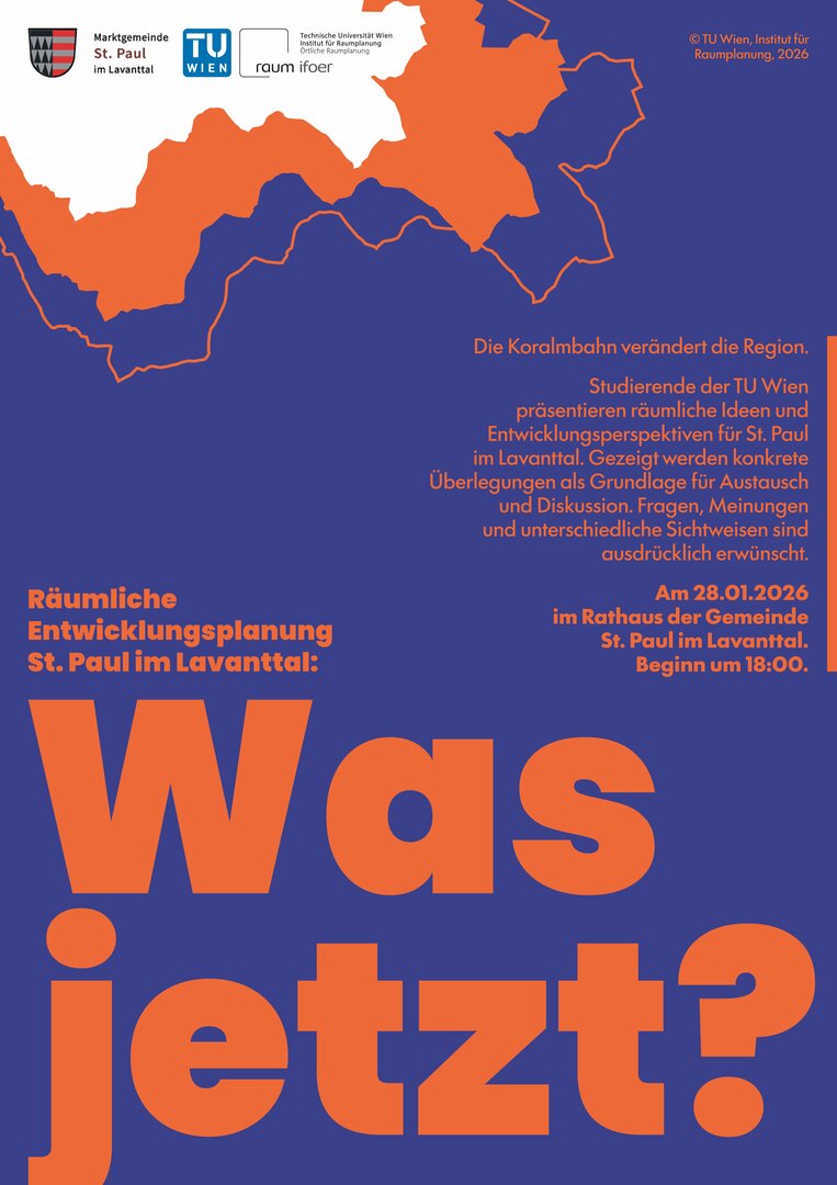 Die Koralmbahn verändert die Region. Studierende der TU Wien präsentieren räumliche Ideen und Entwicklungsperspektiven für St. Paul. Gezeigt werden konkrete Überlegungen als Grundlage für Austausch und Diskussion. Fragen, Meinungen und unterschiedliche Sichtweisen sind ausdrücklich erwünscht.